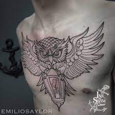 Traditional tattoo owl chest. This owl head figure tattoo has some interesting patterns almost a traditional style tattoo. The owl on the chest is generally caught with its wings spread wide covering the heart and soaring off into a space we cannot see. 32 Awesome Chest Tattoos For Men The Trend Spotter.